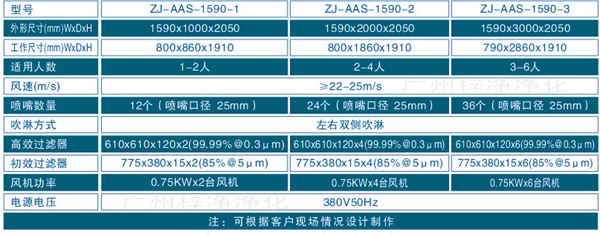 7、配1臺大風量風淋設備專用風機,功率:0.75KW/臺,確保吹淋效果,風速≥22-25m/s, 雙側吹淋,配12個不銹鋼噴嘴。