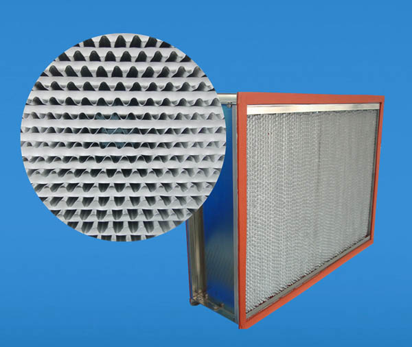 耐高溫高效過濾器使用隔板式設計,波紋形隔板可以精確地保持褶層間距,有小阻力下,有大限度地用濾料。過濾器濾材兩面180褶翻折形成鍥形褶層,濾料折彎時有兩道壓痕,使其在隔板的尾端開成鍥形盒式褶層,鍥形盒式褶層可以防止濾料破損。