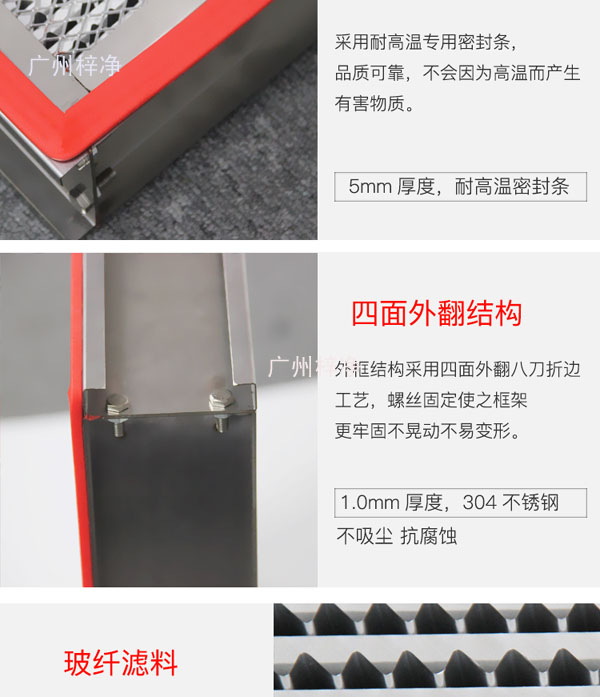 烤箱耐高溫過(guò)濾器外框材料要求:烤箱耐高溫過(guò)濾器在250℃以下可選鋁型材框、鋁板折框、鍍鋅框、不銹鋼框;250℃以上必須選用鍍鋅框或不銹鋼框??鞠淠透邷剡^(guò)濾器密封膠:紅色硅膠(250~280℃)。