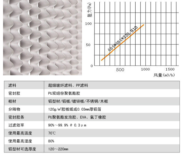 1、采用波紋形隔板,褶層間距相等,風量大、阻力低。