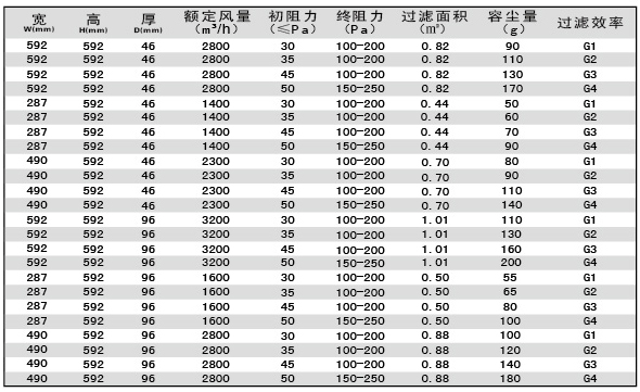 初效過濾器規格尺寸及型號參數: