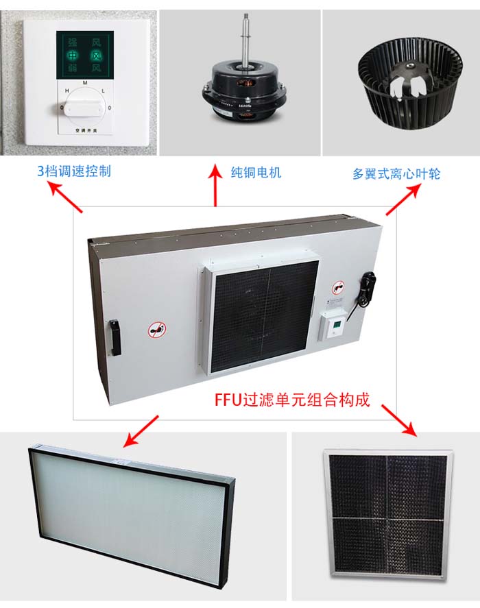 FFU以自循環過濾送風方式,將靜壓室的干凈空氣經過高效過濾、除味、殺菌處理送入凈化工作間,根據其送風量的多少,使凈化間內的空氣塵埃粒子控制在一定的范圍內。