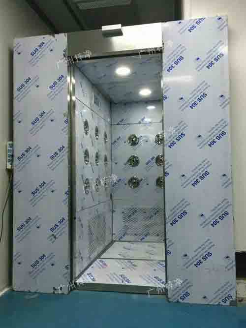 7、配2臺風淋室專用風機,總功率:0.75KW/臺,確保吹淋效果,風速≥22-25m/s, 左右兩側吹淋,配12個不銹鋼噴嘴。