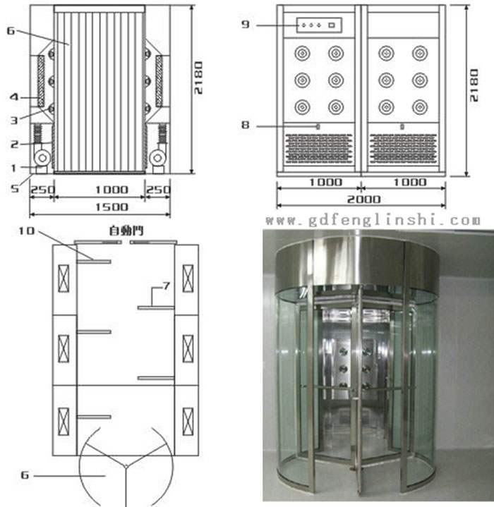 A、旋轉門風淋室由大箱體(風機、過濾器安裝于此箱體內)、小箱體(雙吹風淋室此側安裝噴嘴,數量與大箱體一致、頂板(安裝內嵌式照明燈)、內底板(不銹鋼砂板)、旋轉門體與其它配件:過濾器,風機,智能電路板,噴嘴,照明燈等組成。