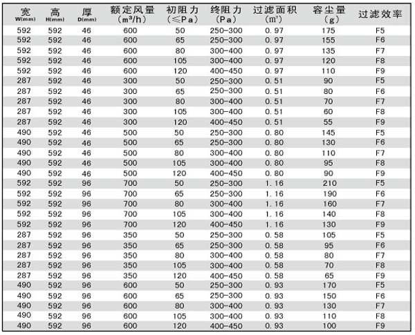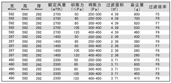 中效過濾器常用規(guī)格尺寸及技術(shù)參數(shù):