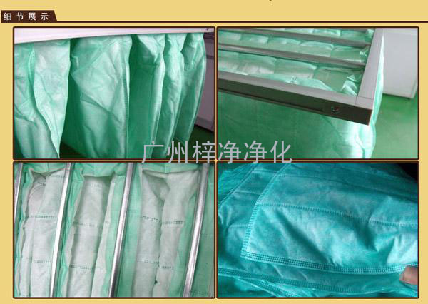 梓凈袋式中效過濾器材料及性能:外框:鍍鋅框、鋁框、不銹鋼框,21mm,25mm厚法蘭,內(nèi)框:鍍鋅內(nèi)框條+鍍鋅壓條。