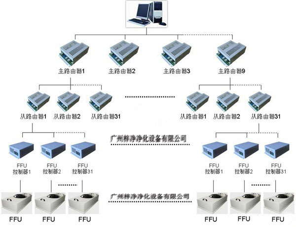 群控FFU智能群控系統采用主控(PC機)——RS232/485轉換接口——主路由器——從路由器——FFU控制模塊4層結構,主控(PC機)最多可管理9臺主路由器,每臺主路由器可管理31臺從路由器,從路由器最多不超過255臺,每臺從路由器可控制31臺FFU控制模塊,系統最多可控制7905臺FFU風機。