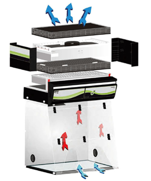 b、無管道通風柜工作原理:不需要外接管道,通過風機系統工作產生負壓,使有害氣體自下而上被吸附到過濾器中,潔凈的空氣循環到室內,在凈化柜內氣體的同時祛除實驗室內有害氣體。