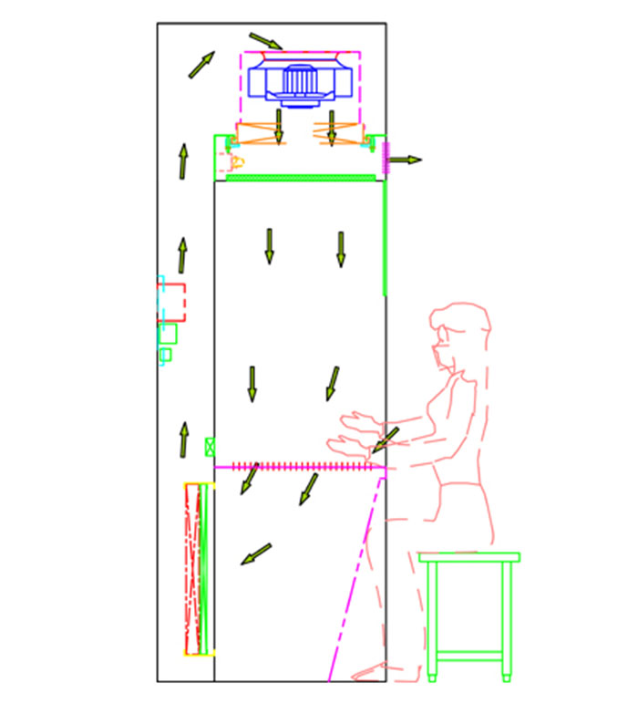 在離心風機提供的壓力下,通過高效過濾器,使之達到潔凈要求。潔凈氣流被送至送風箱體內,90%通過均流送風網板,形成均勻的垂直送風氣流,10%則通過風量調節板,排出設備。所有氣流均經過高效過濾器處理,所以送風,排風均不帶殘余粉塵,避免了二次污染。由于在工作區域形成穩定的單向流,在此區域中散發的粉塵,會在單向氣流的影響下,隨著氣流而被初效過濾器所捕集。設備帶有10%的排風,從而形成相對與外部環境的負壓,從一定程度上保證了此區域內的粉塵不會擴散至室外,起到保護外部環境的作用。