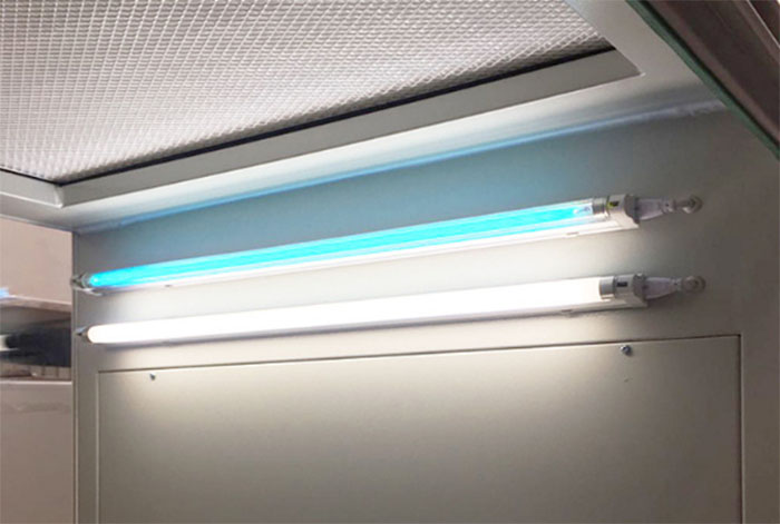 在無塵工作臺上亦可吊裝紫外線燈,但應裝在照明燈罩之外,并錯開照明燈平行排列,這樣在工作時不妨礙照明。若將紫外線燈裝入照明燈罩(玻璃板)里面,這是毫無用處的,因為紫外線不能穿透玻璃,它的燈管是石英玻璃,而不是硅酸鹽玻璃制成的。